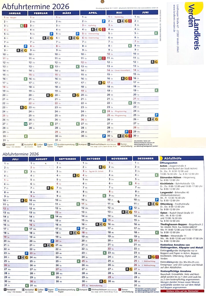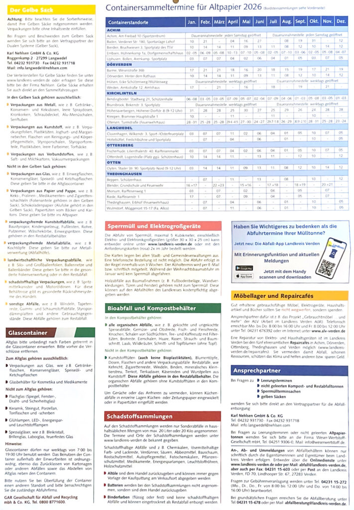 Das Sammelgut jeweils bis 9:00 am Straßenrand bereitstellen. Abholung zwischen 9:00 und 16:00Uhr.